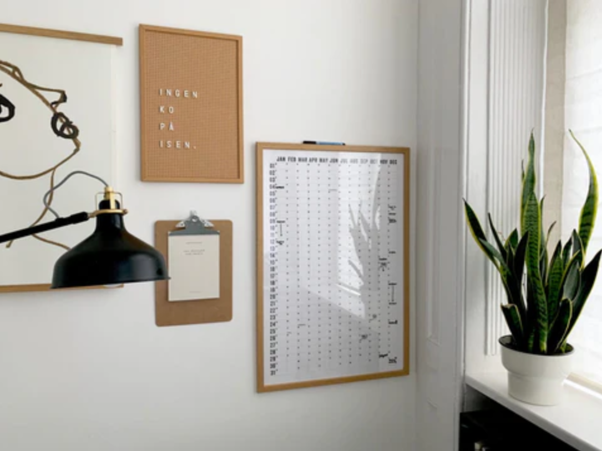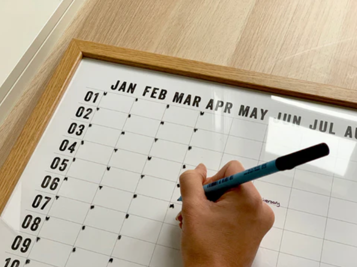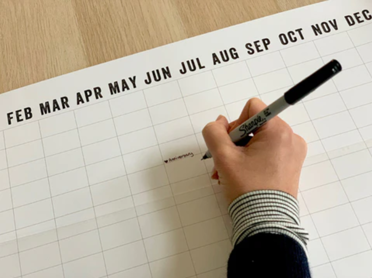 1. You'll write any recurring annual dates directly onto the paper calendar (birthdays, anniversaries, etc.). Then you'll frame the print and use an erasable correctable pen (such as these ones) to write dates for the year ahead.