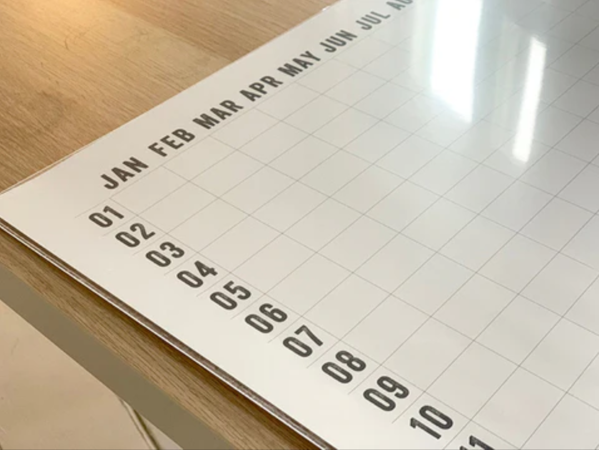 Your calendar might have a slight roll to it, depending on how you receive it. I recommend taking the glass or plexi out of the frame you plan to use for the calendar, and laying it over the calendar on a flat, clean surface for at least 12-24 hours to allow the design to flatten before writing on it.