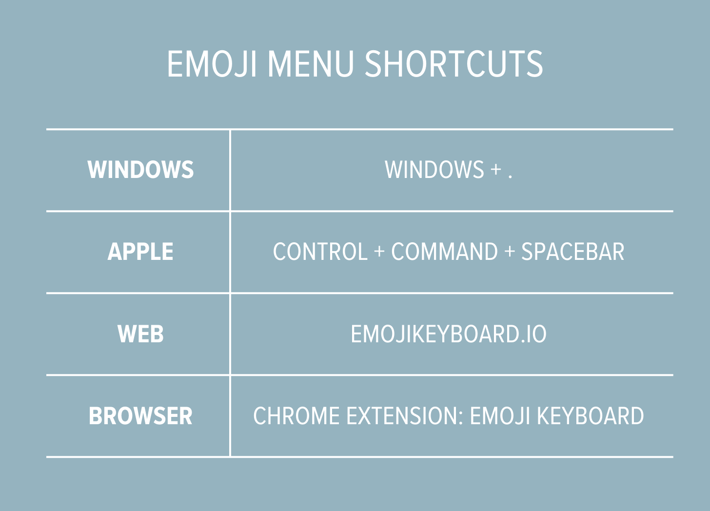 On an Apple computer, you’ll hit Control + Command + Spacebar to access emojis.